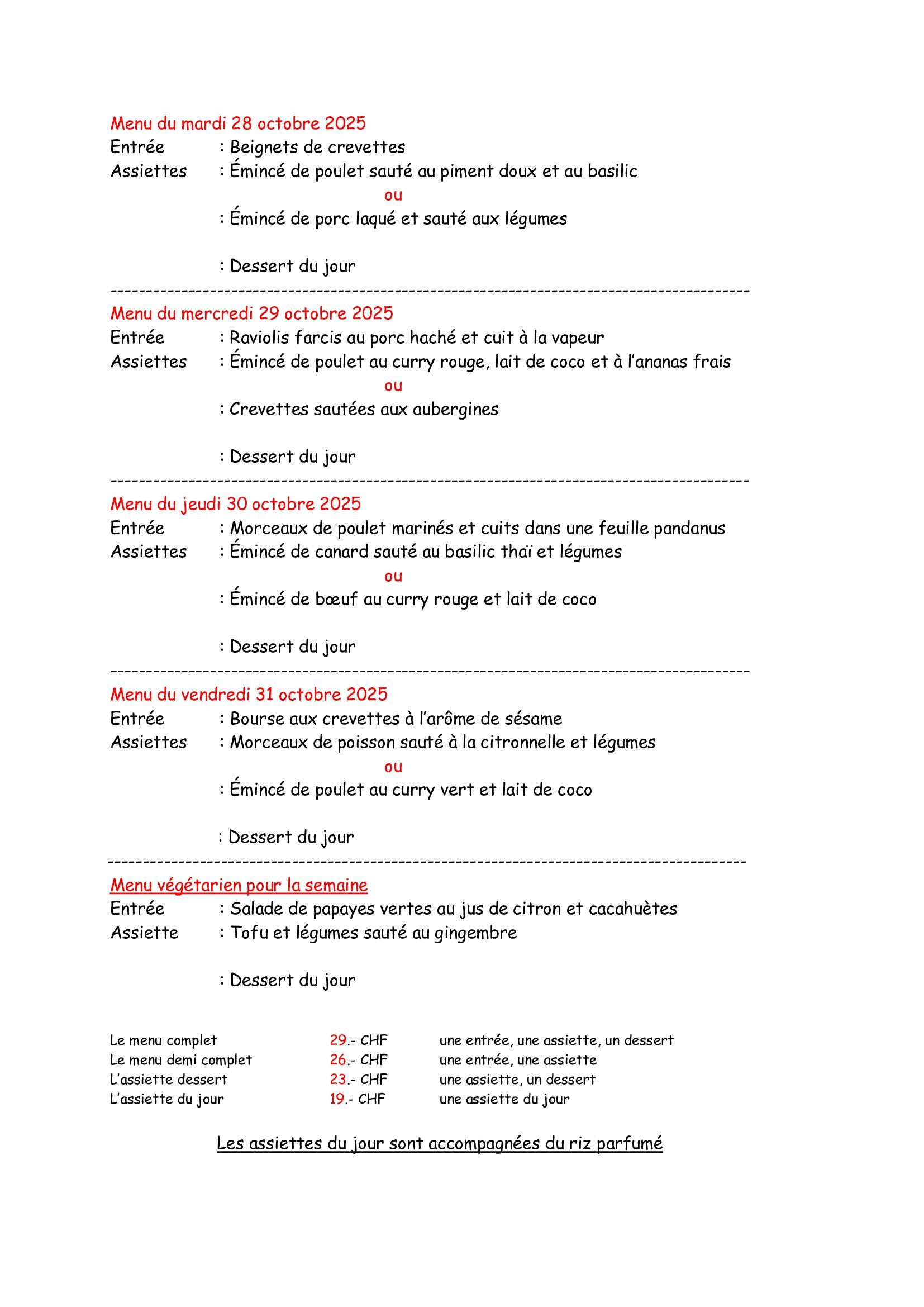 Chaque jour, nos chefs préparent un menu unique et savoureux, inspiré des saveurs authentiques de la Thaïlande. Le midi, laissez-vous surprendre par une proposition fraîche et originale, élaborée à partir d’ingrédients de saison et cuisinée à la minute, dans le respect des traditions thaïlandaises.